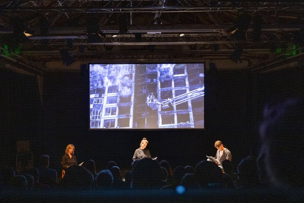 Im Zentrum der Festival-Eröffnung stand die Multimedia-Performance „Chronicles of war, love and hatred“, eine Produktion des media theatre Lwiw um Sashko Brama, Maria Yasinka und Liuda Batalova zusammen mit dem post:theater berlin. Die Chroniken illustrierten quasi in actu die Auftaktdiskussion um die ästhetische Reaktion auf einen Krieg.