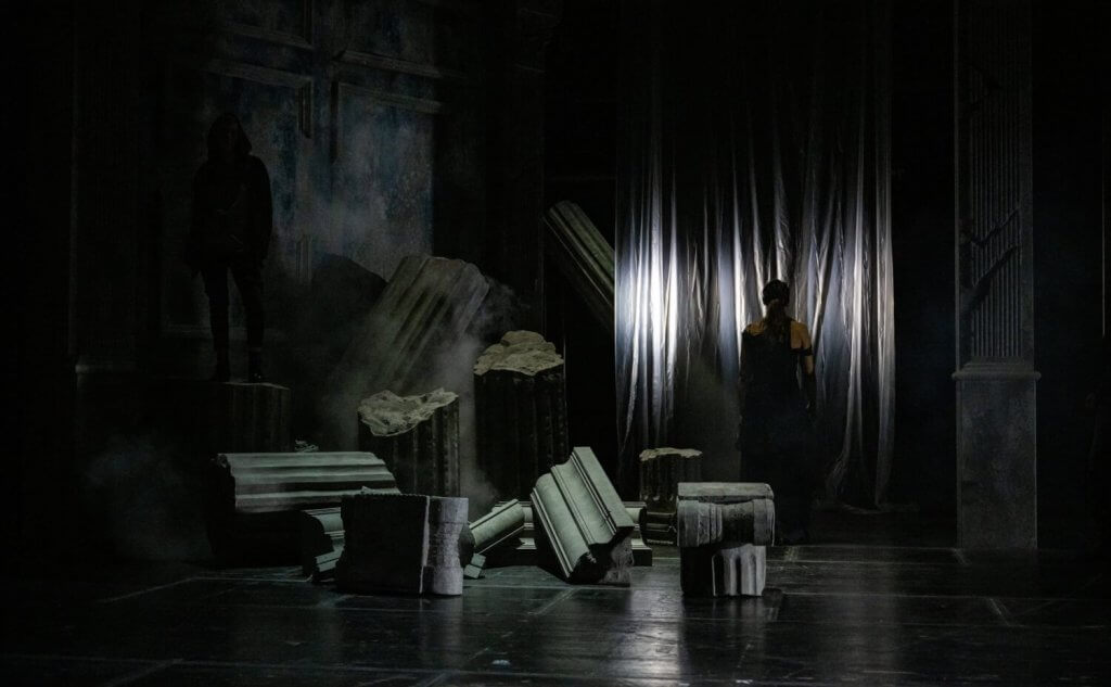 „Was richtet dieses Land bloß mit mir an?“ Das ist ein Satz, der gleich zu Anfang gesagt wird – ein Leitmotiv für alle Beteiligten in „Mamma Medea“. Die Bühne von János Mira und Sofia Mazzoni wirkt wie eine Mischung aus Abrissgebiet samt bröckelndem Putz und Baustelle mit flatternden Folien. Ein Niemandsort in den Augen von Neuankömmlingen. Solchen wie Jason, der aus Griechenland nach Kolchis kommt, um das Goldene Vlies, das Zauberfell eines Widders, zu rauben. Medea, die Tochter des Königs von Kolchis, der man Zauberkräfte nachsagt, hat sich bis zur Blindheit in ihn verliebt und hilft ihm nun dabei. Sie wird schuldig, verrät ihren Vater, tötet ihren Bruder und flieht mit Jason nach Korinth. Doch Jason, der wendige Grieche, versucht seine Lage zu verbessern, indem er die Tochter von König Kreon heiratet. Medea mit den Kindern stört diesen gewollten Neuanfang – sie sollen fort.