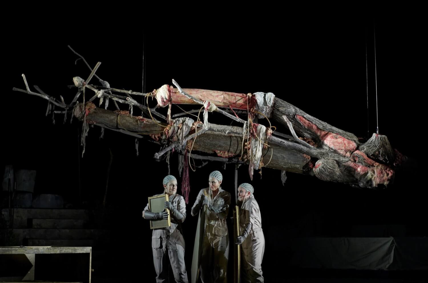 Marco Štorman, der den dritten Tag des Bühnenfestspiels im Stuttgarter „Ring“ übernommen hat, kann ganz neu anfangen, ist nicht gebunden an das, was seine Vorgänger:innen gemacht haben. Er zeigt eine in Auflösung begriffene Welt, in der alte Wahrheiten nicht mehr gelten, gesellschaftliche Verabredungen nicht mehr funktionieren und die Figuren darauf auf unterschiedlichste Art reagieren. Demian Wohler hat ihm die Bühne dafür mit germanischen, antiken, christlichen Elementen ausgestattet, die keinen einheitlichen Raum bilden, ineinander übergehen, an eine Kirche erinnern oder an einen Plenarsaal. Immer wieder werden monumentale Gemälde über die Bühne getragen, aufgestellt oder aufgehängt, die das Erzählte zum einen illustrieren, die aber auch unterschiedlich interpretiert werden können. Ein jeder kann sich halt seine eigene Wahrheit schaffen. Wie ein Damoklesschwert schwebt die von Wotan geschändete blutende Weltesche, die krebsartige Wucherungen aufweist und mit Blut selbst notdürftig am Leben gehalten wird, über allem und erdrückt schließlich den nach dem Ring greifenden Hagen. So rächt sich die Natur für begangenes Unrecht und so wirkt die Vergangenheit in die Gegenwart hinein und bestimmt auch die Zukunft.