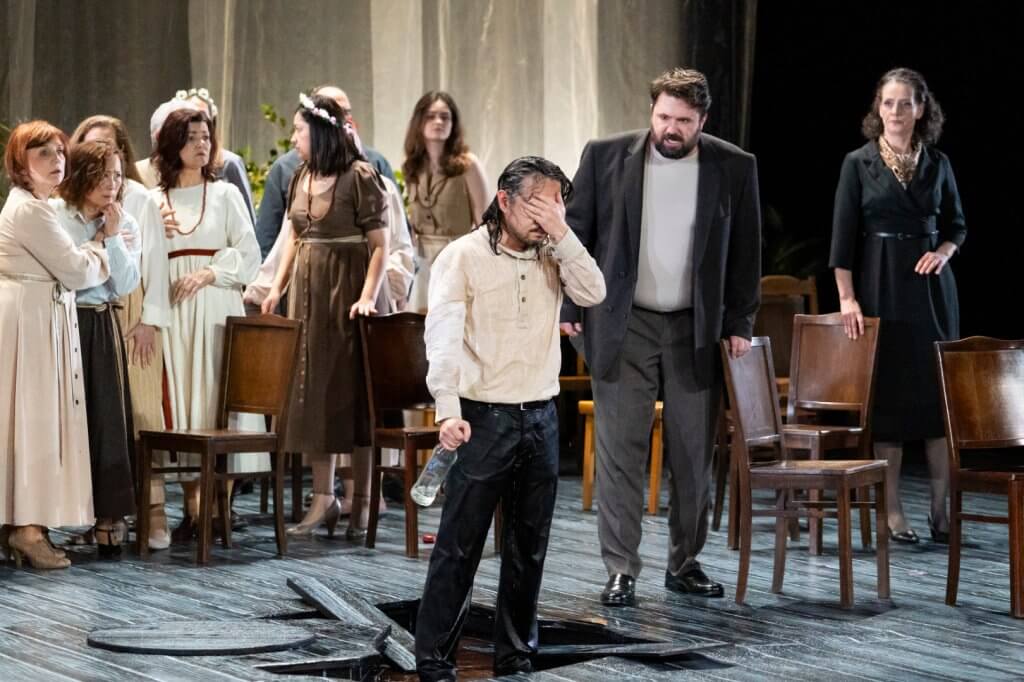 Michael Ha als Lenski (vorn), Grga Peroš als Onegin und Monica Mascus als Larina (rechts). Foto: Lena Bils.