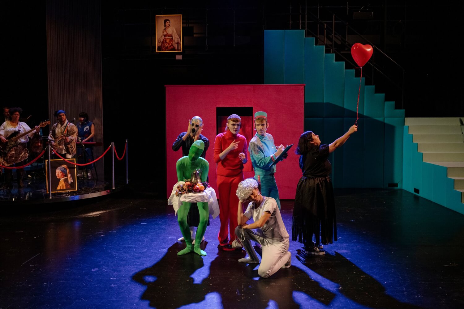 Schüler in ein Kunstmuseum zu schicken, damit sie etwas über die Kunst, aber noch mehr über sich selbst erfahren, ist keine schlechte Idee. Wenn dazu eine Rockband harte Rhythmen erzeugt, wird es nicht nur für ein junges Publikum noch spannender. Ebenso, wenn „Das Bildnis der Tänzerin Anita Berber“ von Otto Dix lebendig wird und die rotgewandete Frau aus dem Bild heraustritt. Wie Svea Kirschmeier diese Red Lady aus den zwanziger Jahren in die Gegenwart zwingt und damit Museumsaufsicht und Schüler durcheinanderwirbelt, ist alleine schon sehenswert in diesem von David Pagan komponierten Rockmusical. Wie sie die Attitüde der zwanziger Jahre des letzten Jahrhunderts annimmt, ohne sie zu karikieren, ist sehenswert. Ihre Auseinandersetzungen als Inbegriff der „Kunst“ mit dem „Museum“, den Maximilian Schaible in einer grünen Uniform (Kostüme: Caroline Stauch) mehr reagierend, als agierend spielt, aber immer charmant, zielen auf grundsätzliche Fragen: Was bedeutet jungen Menschen Kunst?