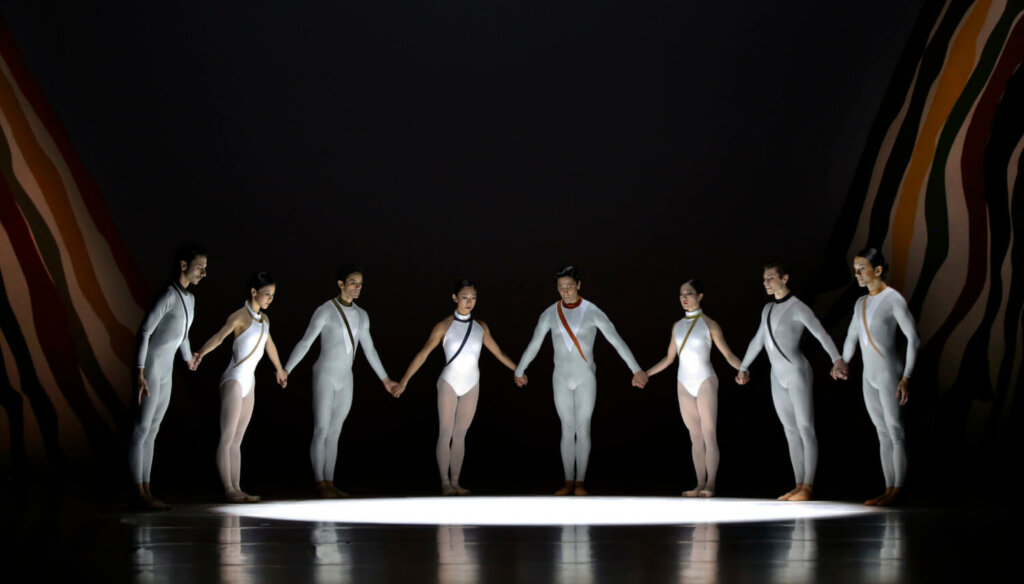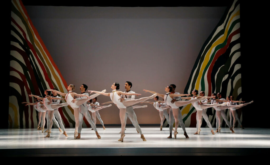 Scholz war wie viele seines Metiers ein Gesamtkunstwerker, der neben der Choreografie gern auch Bühne, Licht und Kostüme selbst verantwortete. Konsequent nutzt er in Beethovens „Siebenter“ nur ein optisches Element: die Linie. Bunte Linien auf halbrunden Hängern im Hintergrund – angelehnt an eine herabfließende Farbtechnik des amerikanischen Künstlers Morris Louis – und einzelne, verschiedenfarbige Linien auf den weißen Bodys der Tänzerinnen und Tänzer. Linien, die sich fortsetzen in Schrittfolgen, überstreckten Hebungen und Ensemble-Formationen als einzigartige Übersetzung von Tonfolgen in Bewegungsmuster. Wie eng Scholz aus der Partitur heraus choreografiert hat, ist hier unverkennbar.