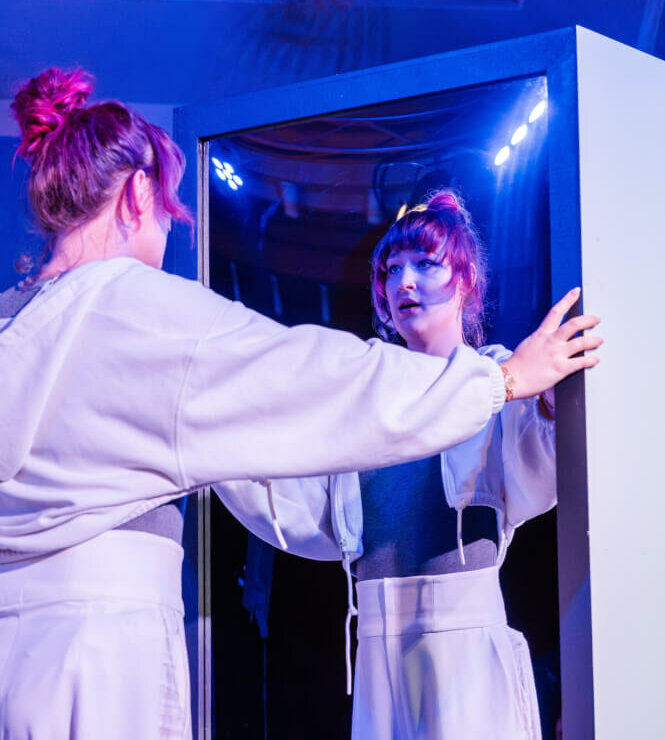 Im Kostüm von Melchior Silbersack – weiße weite Hose, enger Body – spielt und singt sich Helena auf der minimalistischen Bühne (Frank Schmutzler) durch ihre Vergangenheit, steigt auf ihr Krankenhausbett, holt aus rollbaren Regalteilen die Figuren ihres Lebens – Vorhang auf, Vorhang zu – oder dreht diese Regalwände um, so dass riesige Spiegel sichtbar werden, vor denen sie immer wieder ihre Geschlechtsidentität wechselt, wechseln muss, wenn die Mutter ihre heimlichen Schminkaktionen entdeckt. Dabei gelingt Regisseurin Lucia Reichard und Dramaturgin Inken Meents die Gratwanderung zwischen sehr intimen Momenten und prächtig getanzten Musical-Showeinlagen. Helenas Hymne an Jugendliebe David Steiner gehört zu den absoluten Höhepunkten.