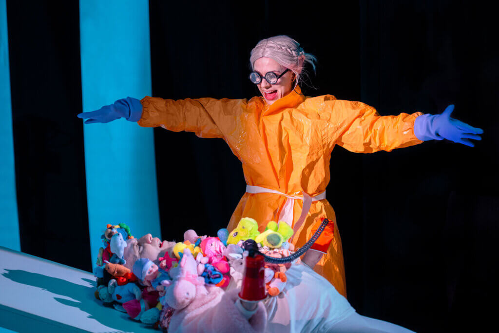 Doch diese Momente überzeugen auch, weil sie aus einer dahinplätschernden Inszenierung ragen. Gutmanns Dialoge wirken oft belehrend und aufgesagt, als wäre es zu viel Text für eine echte Figur – da hilft auch ihr Ansatz einer aufgekratzten und übermotivierten Europa nicht. Dass der zweiköpfige Chor der Schwester absurd mit Echos spielen und bei jeder Erwähnung von „Leben“ eine überdrehte Gestalt mit aufgetackerten Kuscheltieren über die Bühne rennt, entlockt nur wenigen im Publikum Lacher.