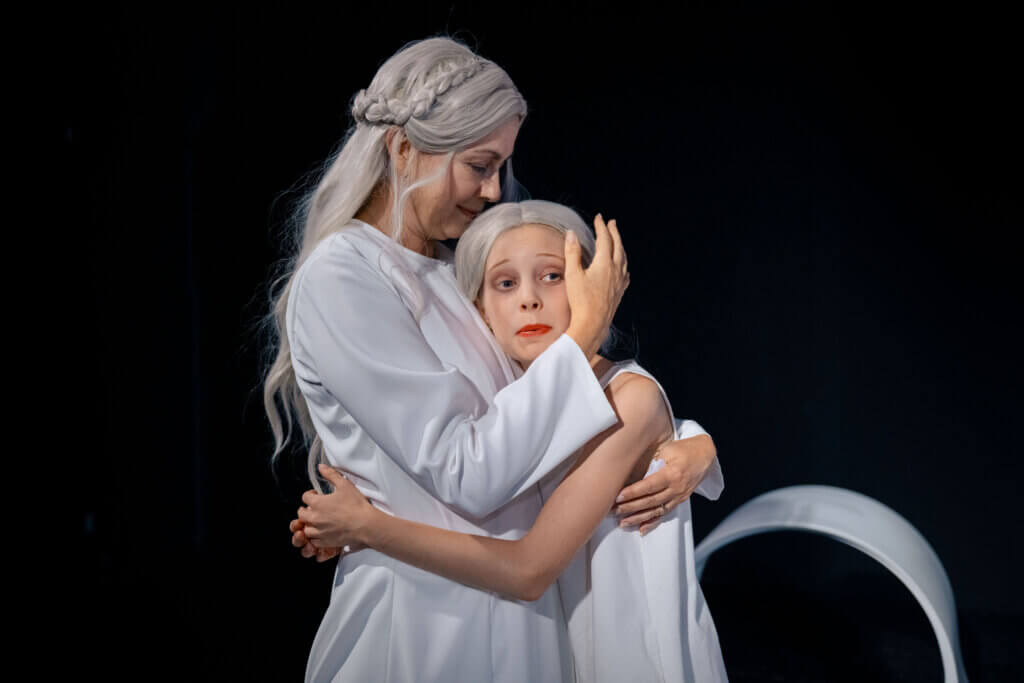 Ausstatter Felix Remme hat sich für eine klares Farbkonzept von Schwarz-Weiß-Rot entschieden. Das fünfköpfige Ensemble ist in schlichte weiße Kleider gewandet und in einem Fall in weiße Leggins, die mit roten Elementen variiert werden. Die Frauen tragen Perücken in Powergrau mit geflochtenen Strähnen, die an die Drachenmutter aus „Game of Thrones“ erinnern und ihnen etwas ätherisches geben. Das rote Partygeschirr vom Anfang taucht immer wieder auf, während die lange Tafel sich zwischenzeitlich in eine Wippe verwandelt.